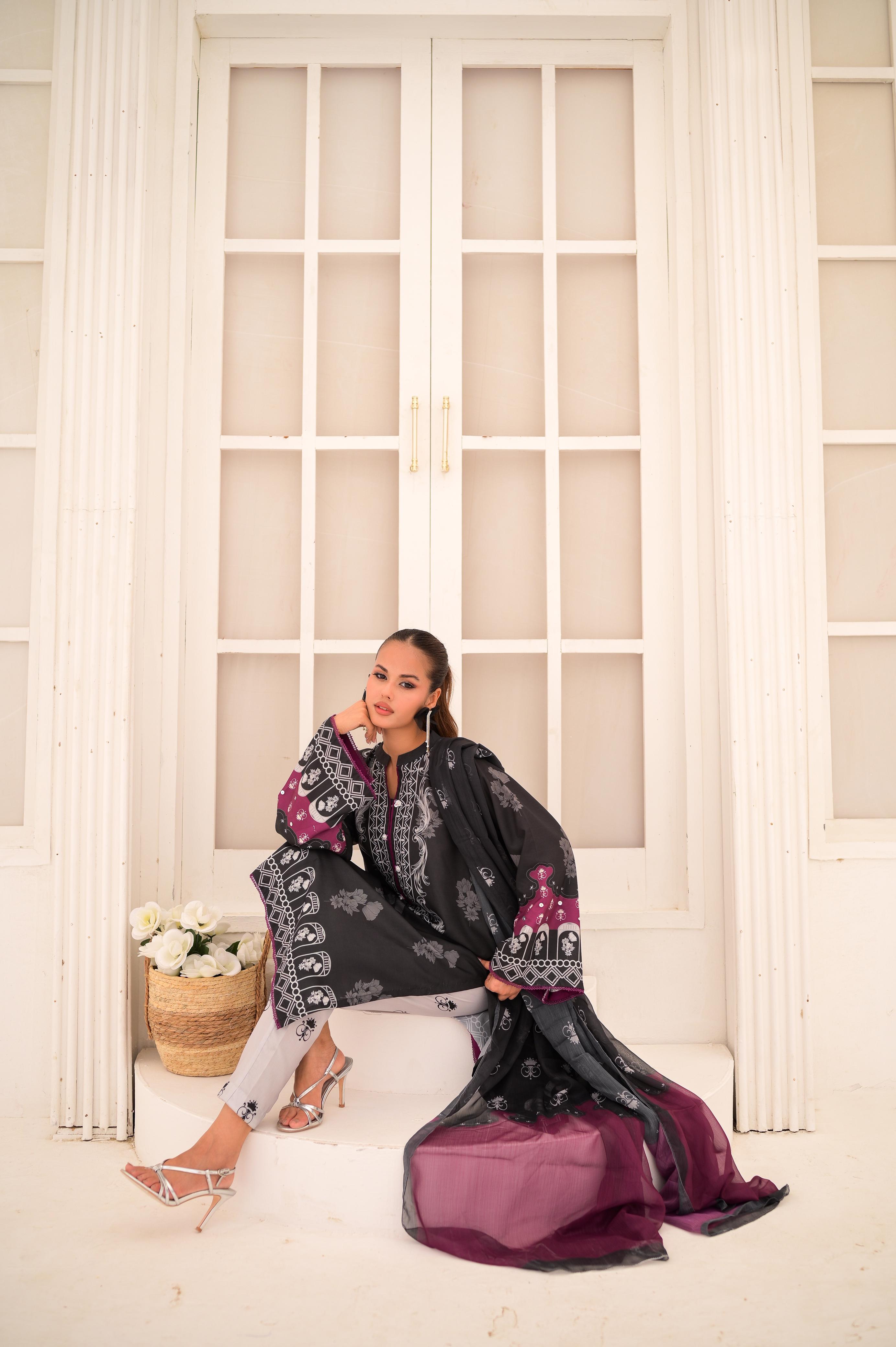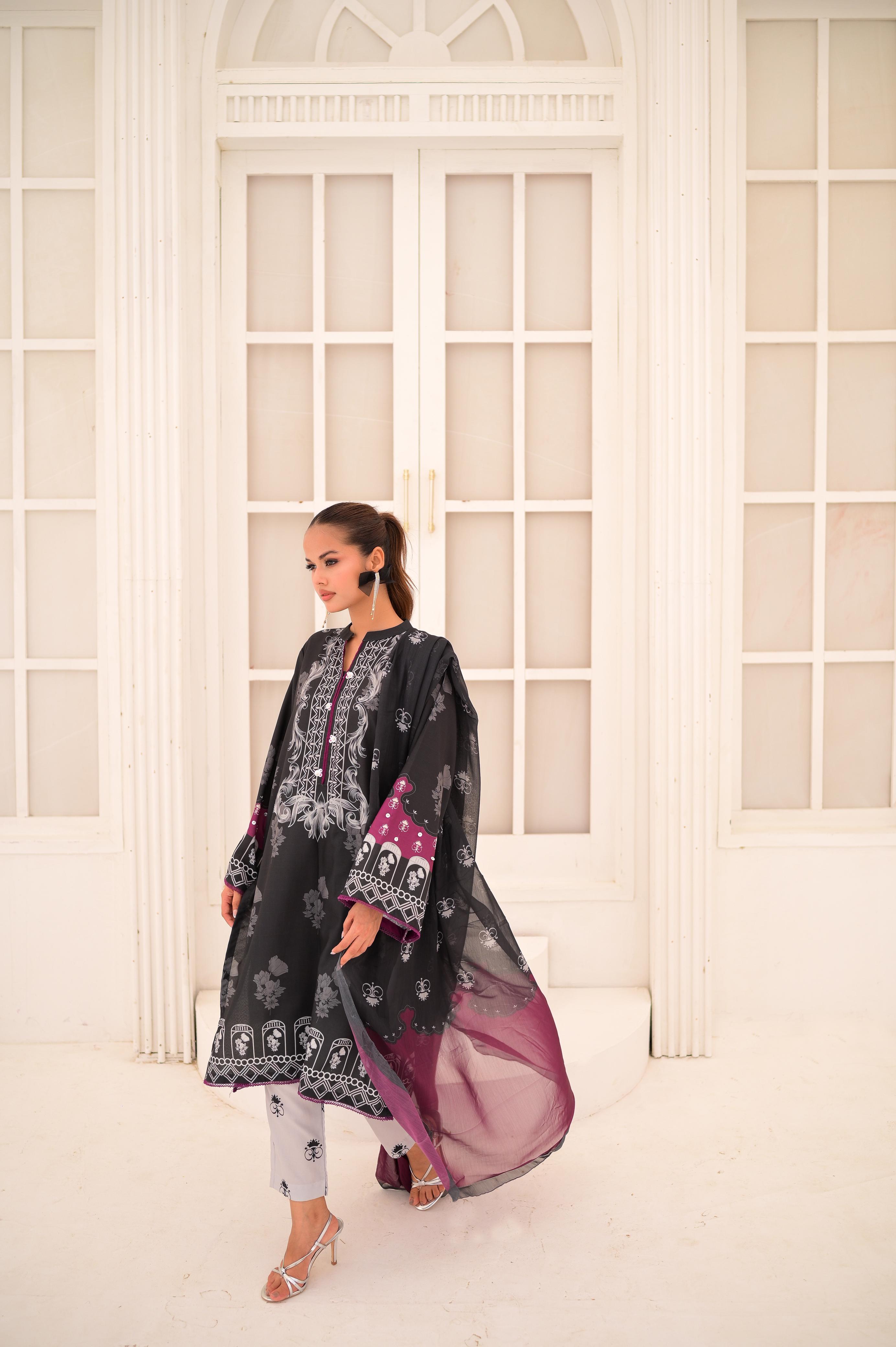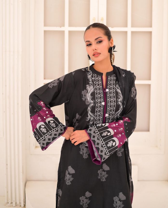 3 piece stitched printed article detailing on neck & sleeves fabric : swiss lawn
