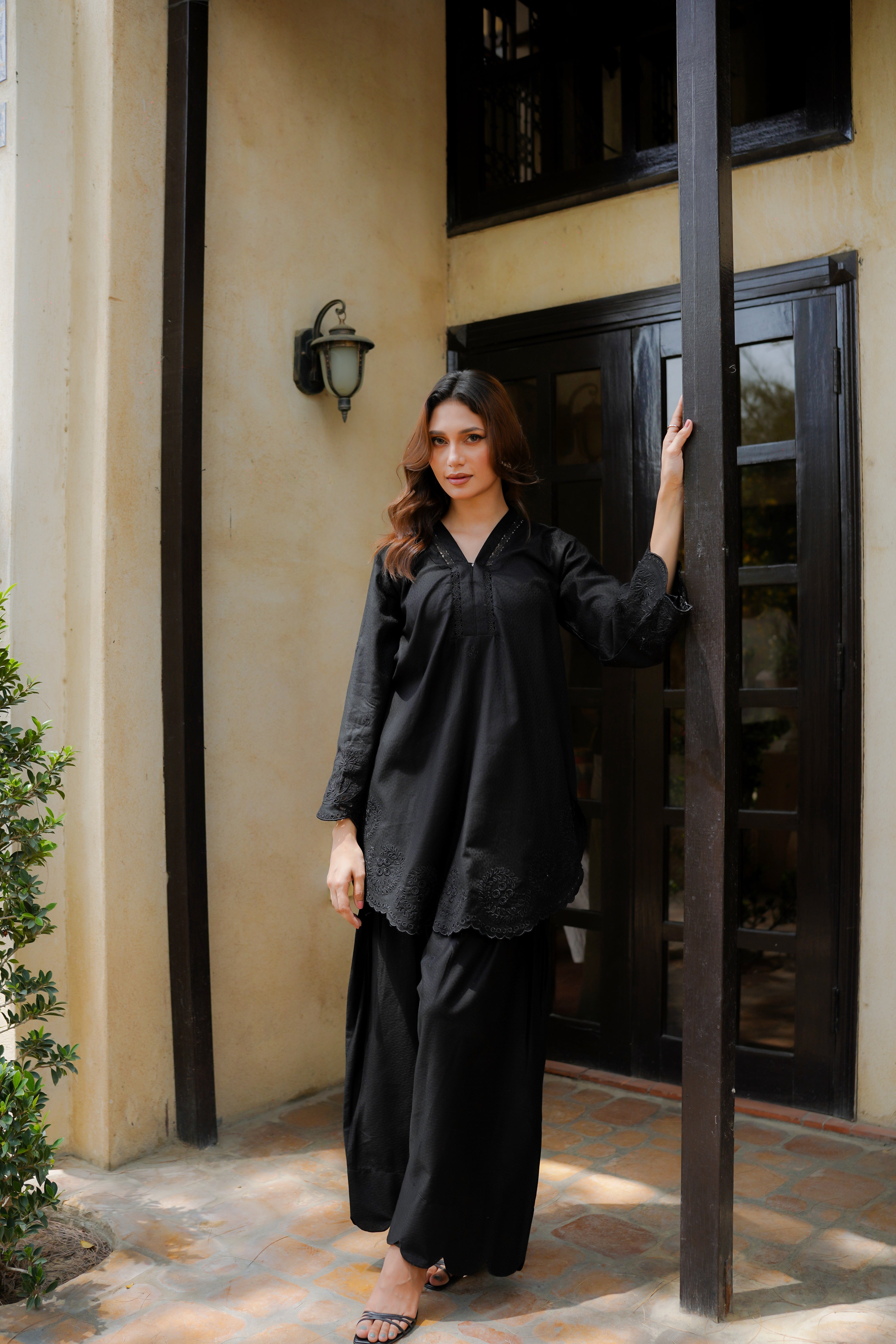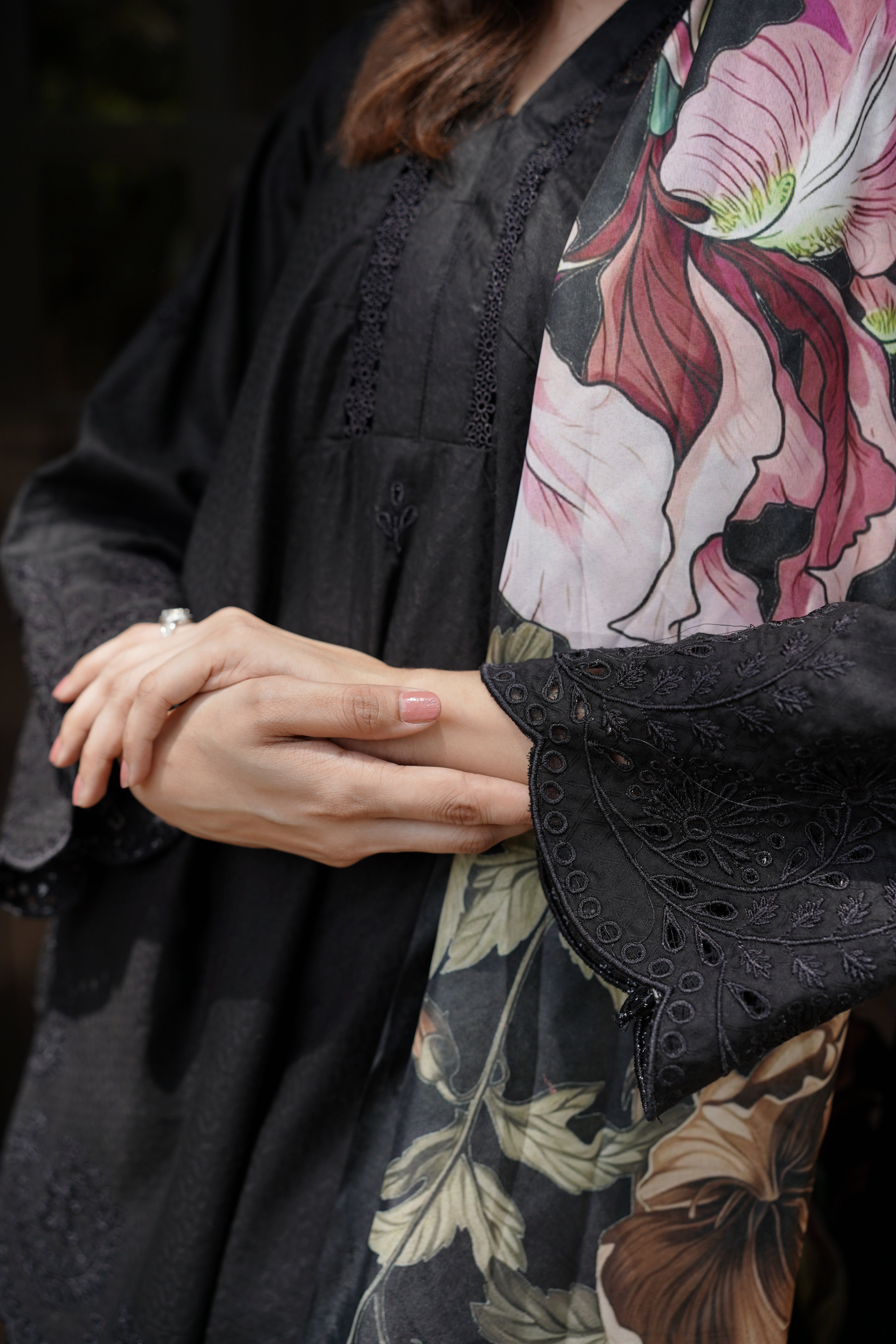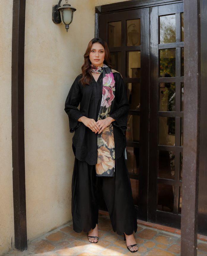 A graceful blend of tradition and style, this set features elegant cutwork and detailed embroidery on the sleeves, trouser, and neckline. It’s beautifully paired with a printed silk dupatta.