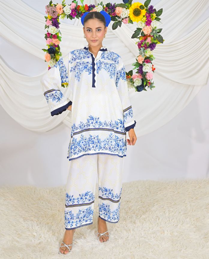 A chic white-base coord set in swiss lawn fabric with dropped shoulders, featuring a morrocon og yellow stroke repeat in the background and exaggerated stroke flowers in deep and royal blue along the neckline, borders, sleeves, and trousers. Paired with relaxed-fit bottoms, this set blends bold florals with effortless comfort.