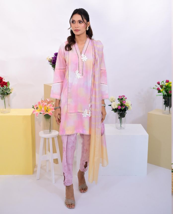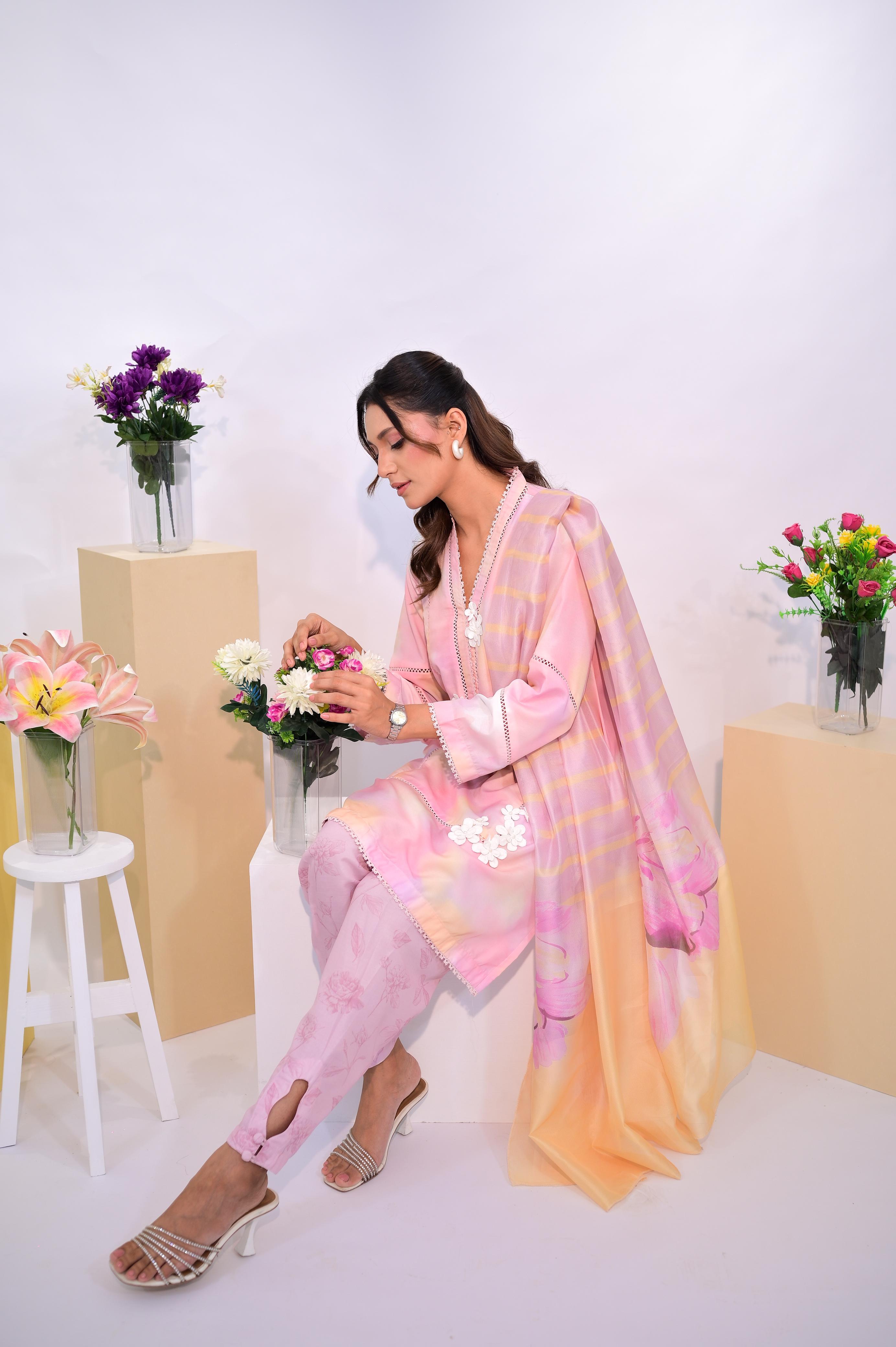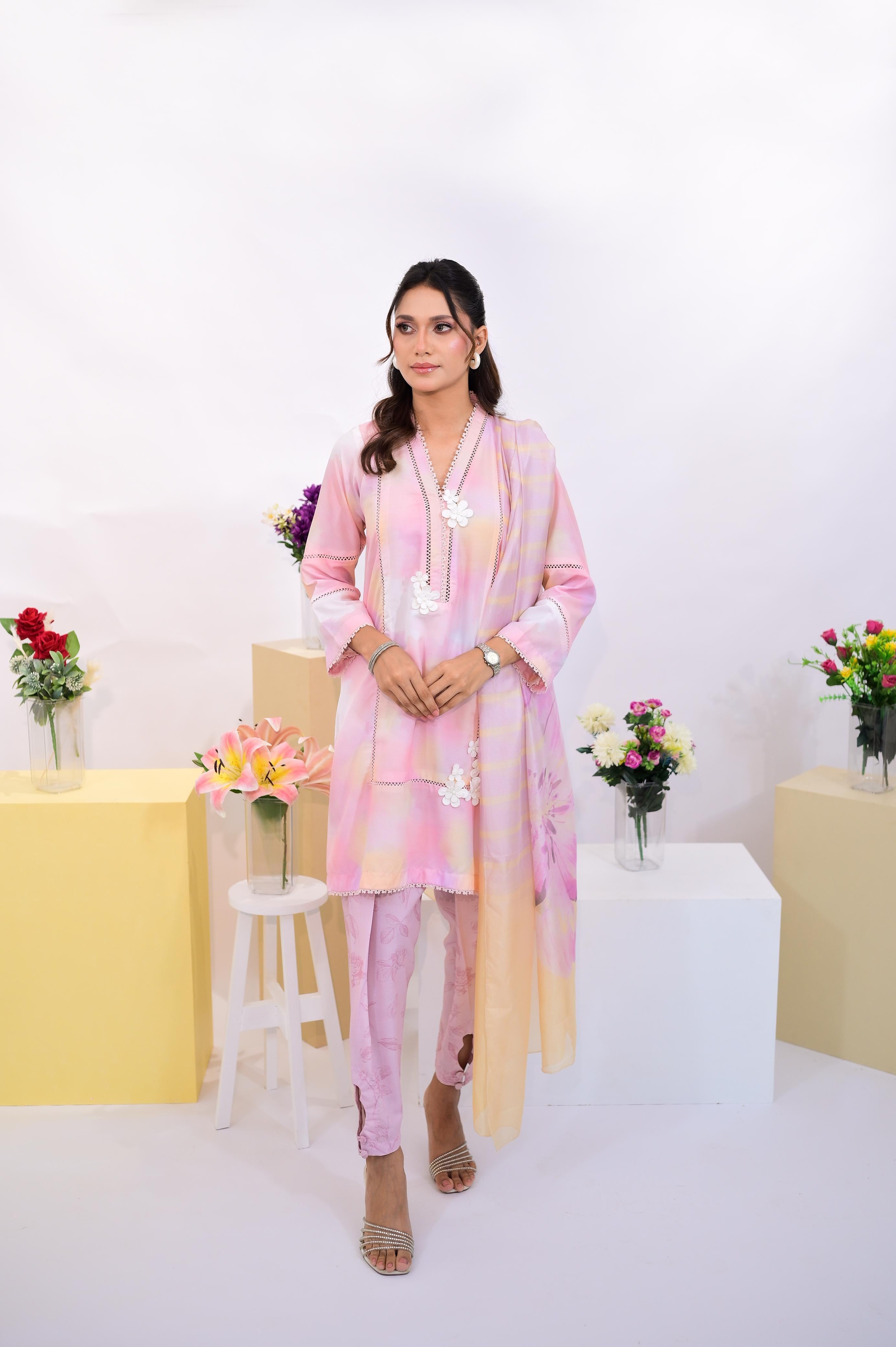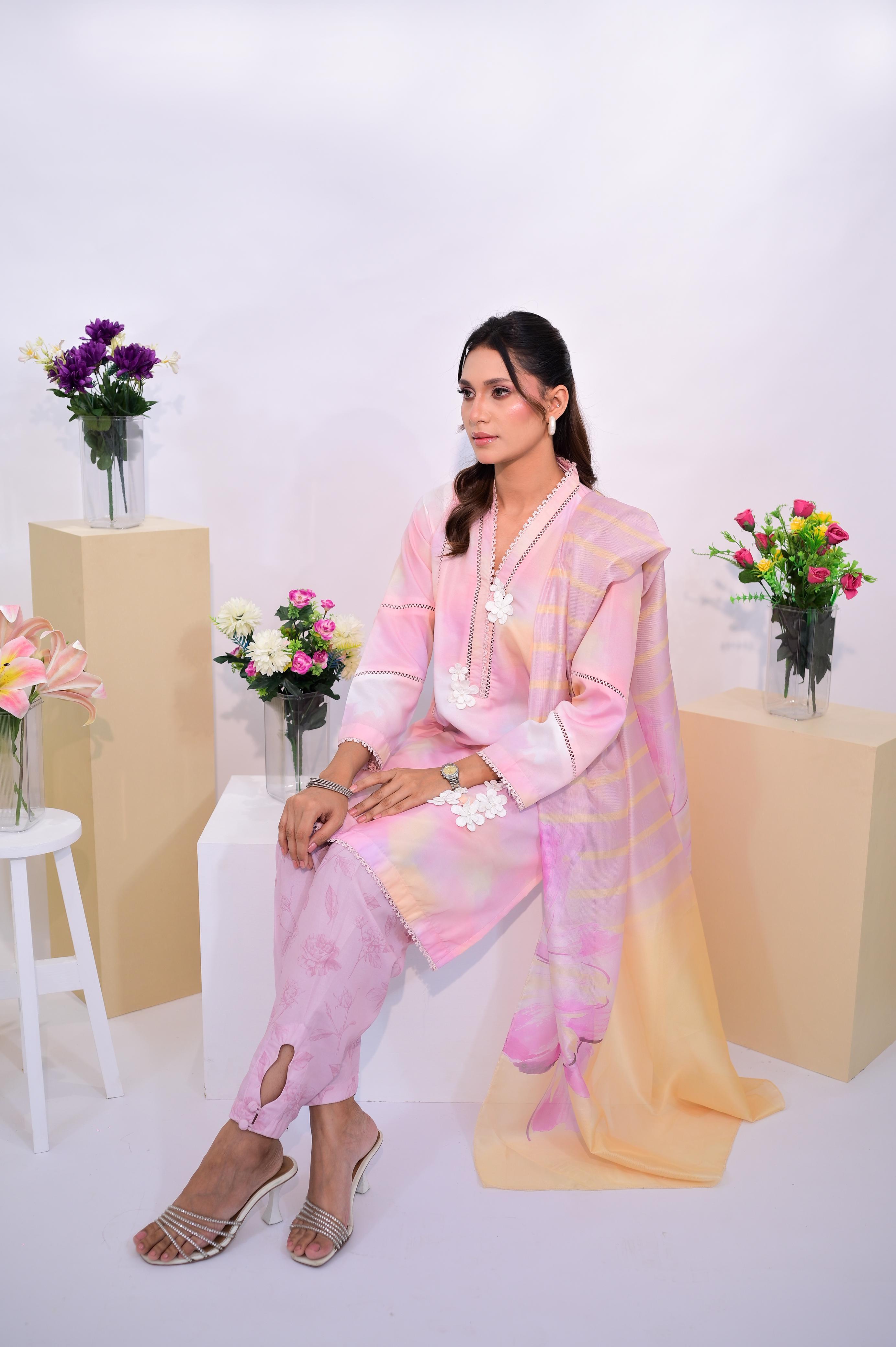 Dupatta: Lightweight silk dupatta in pastel ombré tones (yellow-pink gradient), complementing the shirt’s soft hues.