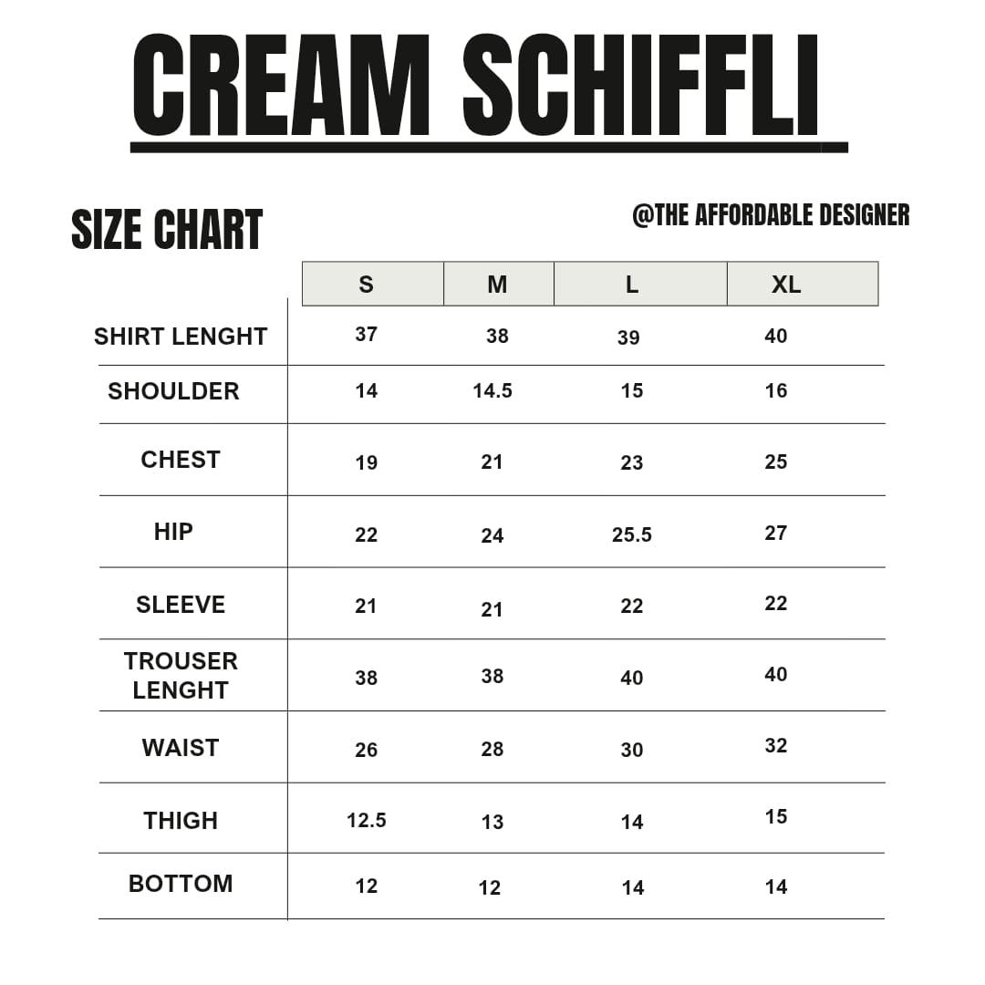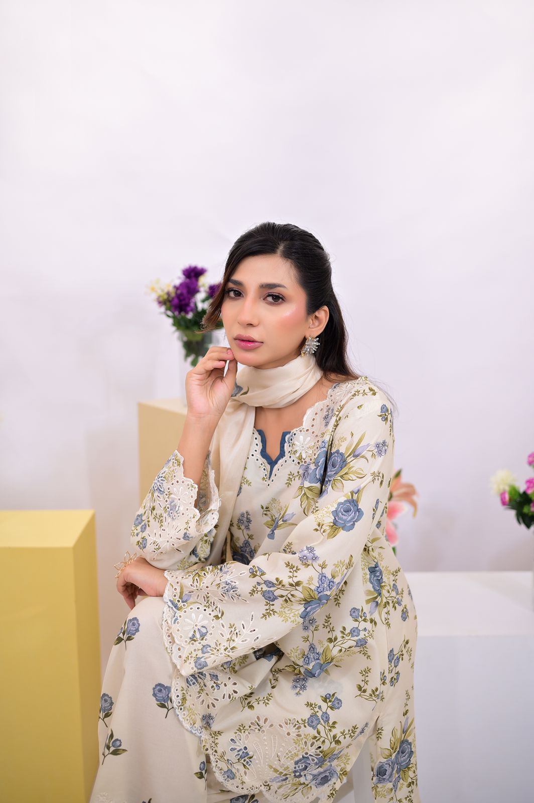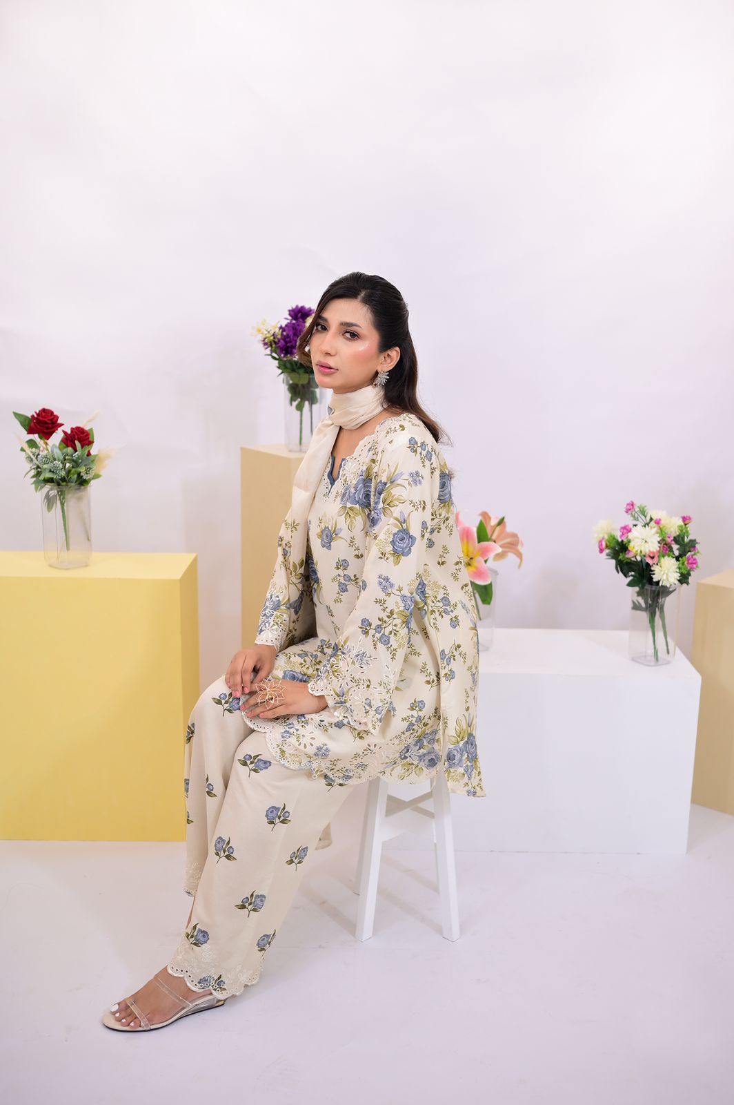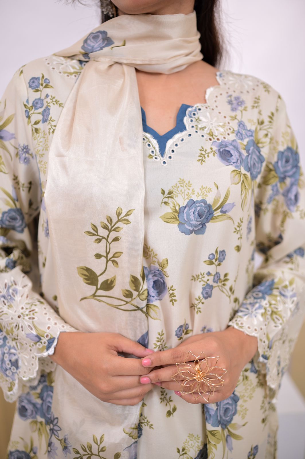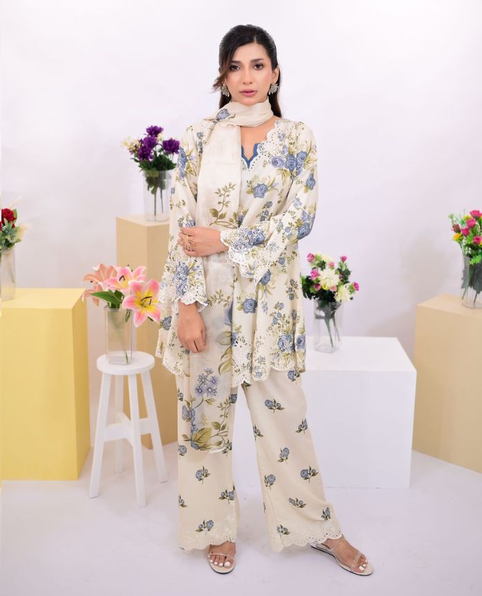 3-piece suit features a cream base with soft blue and green floral prints, beautifully enhanced with delicate embroidered accents. The straight-cut shirt is styled with a contrast blue neckline and scalloped embroidered lace finishing along the sleeves