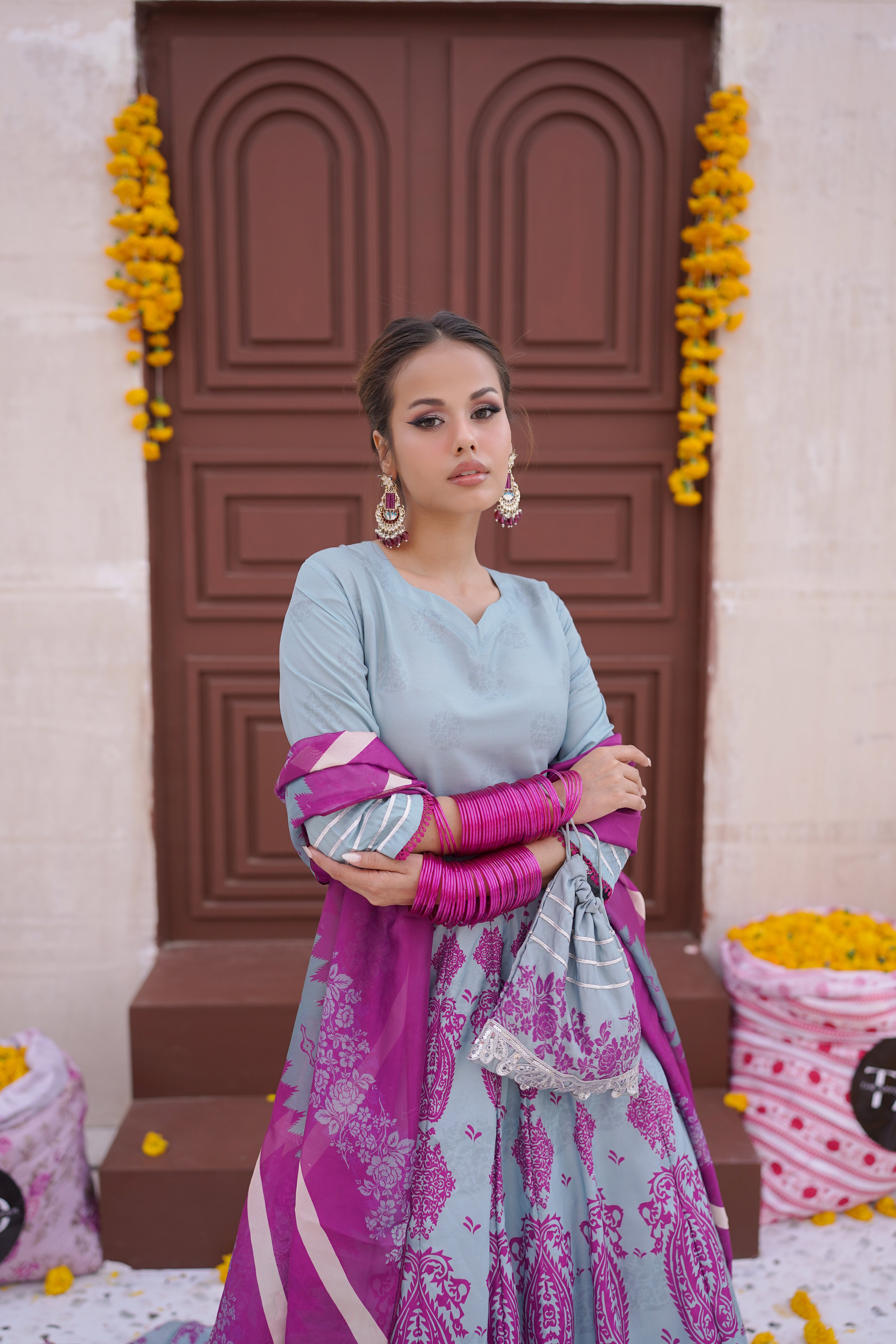 3 Piece stitched lehenga with free potli. Fabric: Swiss lawn Dupatta Fabric: Silk  A vibrant celebration of elegance, this cyan Swiss lawn lehenga set is adorned with subtle self-print and...