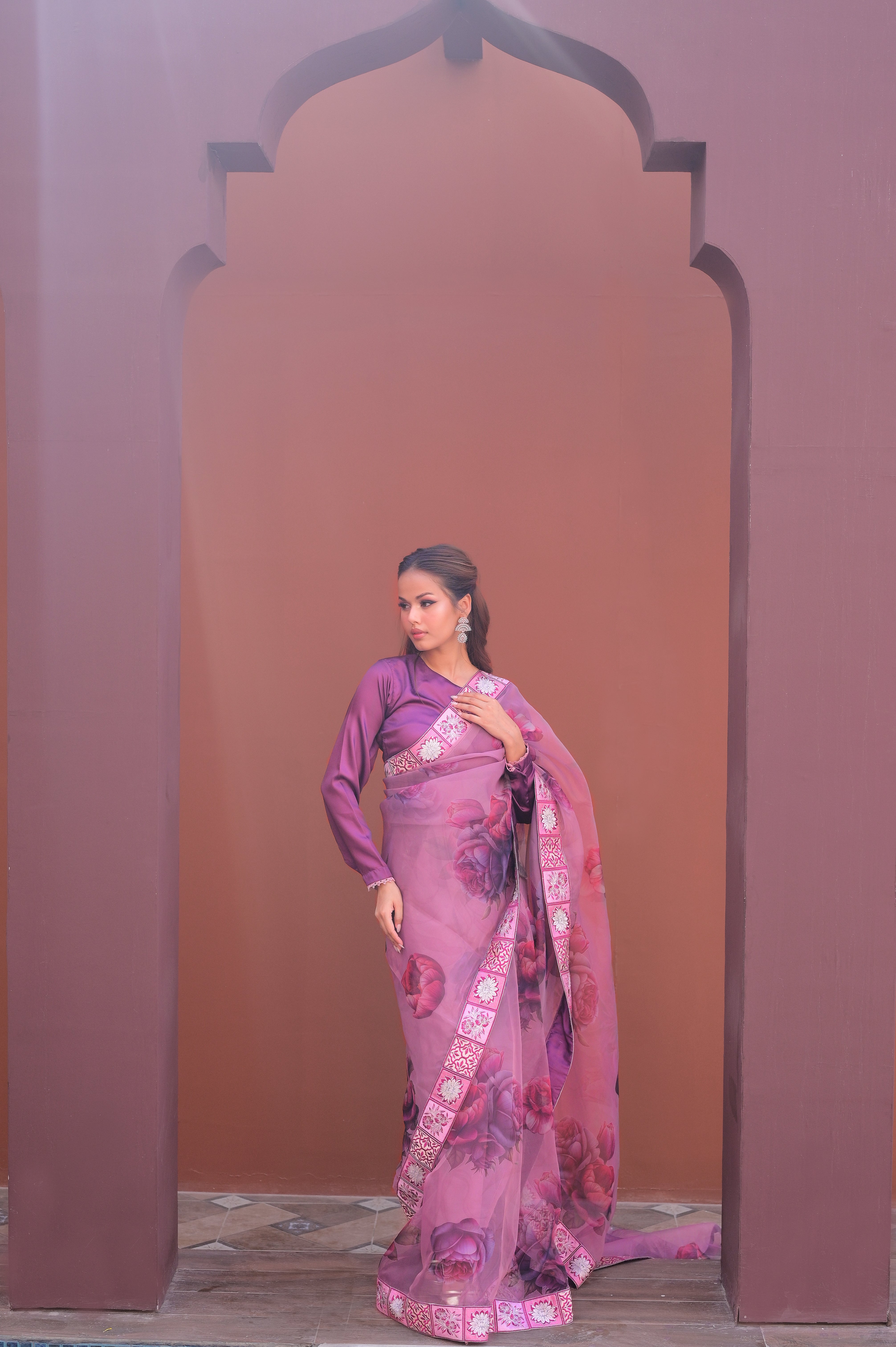 READY TO WEAR.  A dreamy stitched organza saree in a soft tea-pink base adorned with delicate magenta florals, capturing the essence of blooming gardens. The embroidered border gracefully frames the...