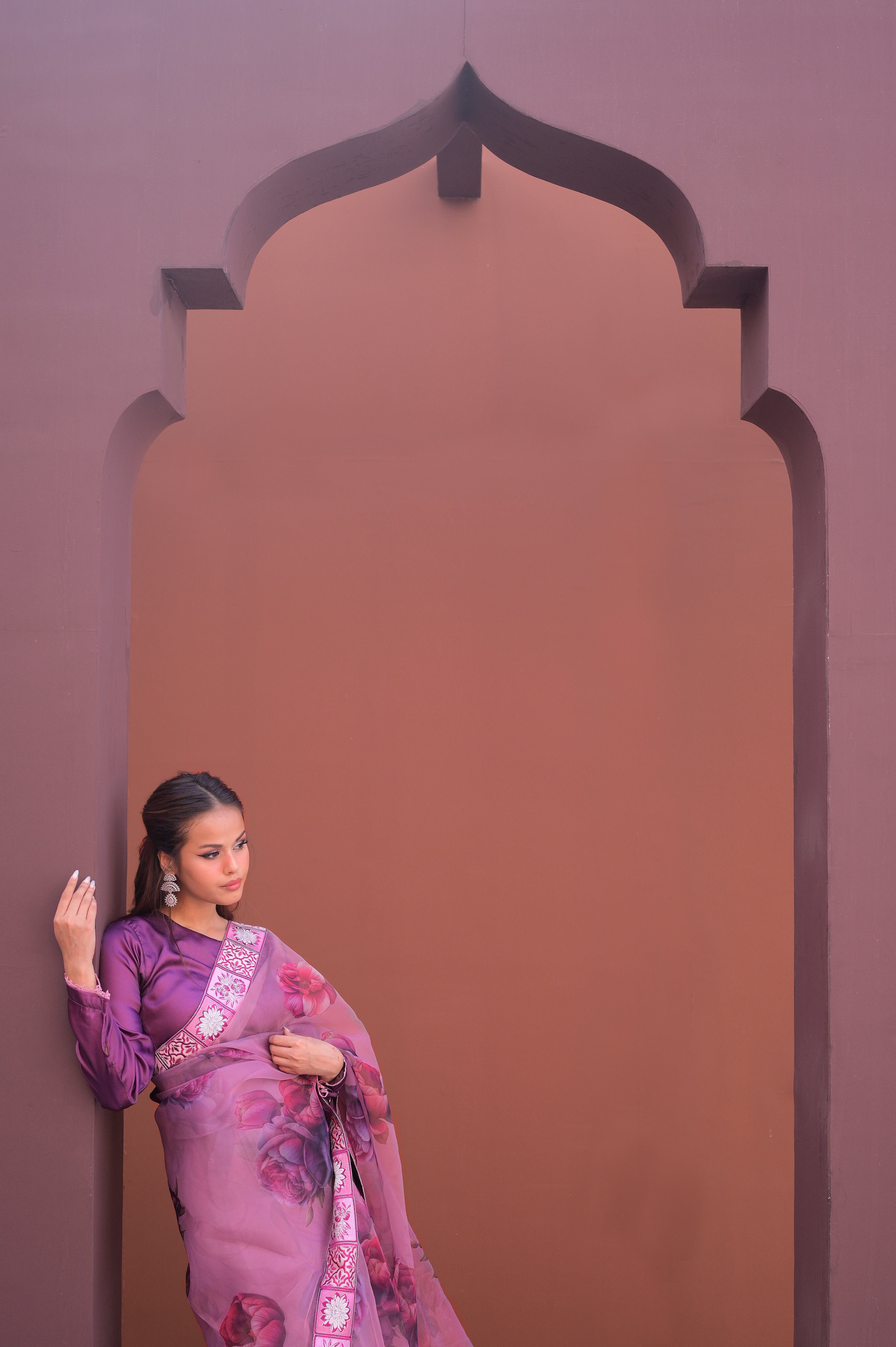 •  A dreamy stitched organza saree in a soft tea-pink base adorned with delicate magenta florals, capturing the essence of blooming gardens. The embroidered border gracefully frames the drape on all sides, adding a hint of luxury. Paired with a lustrous korean silk blouse featuring subtle lace detailing on the back, this ensemble reflects sheer femininity and timeless charm.