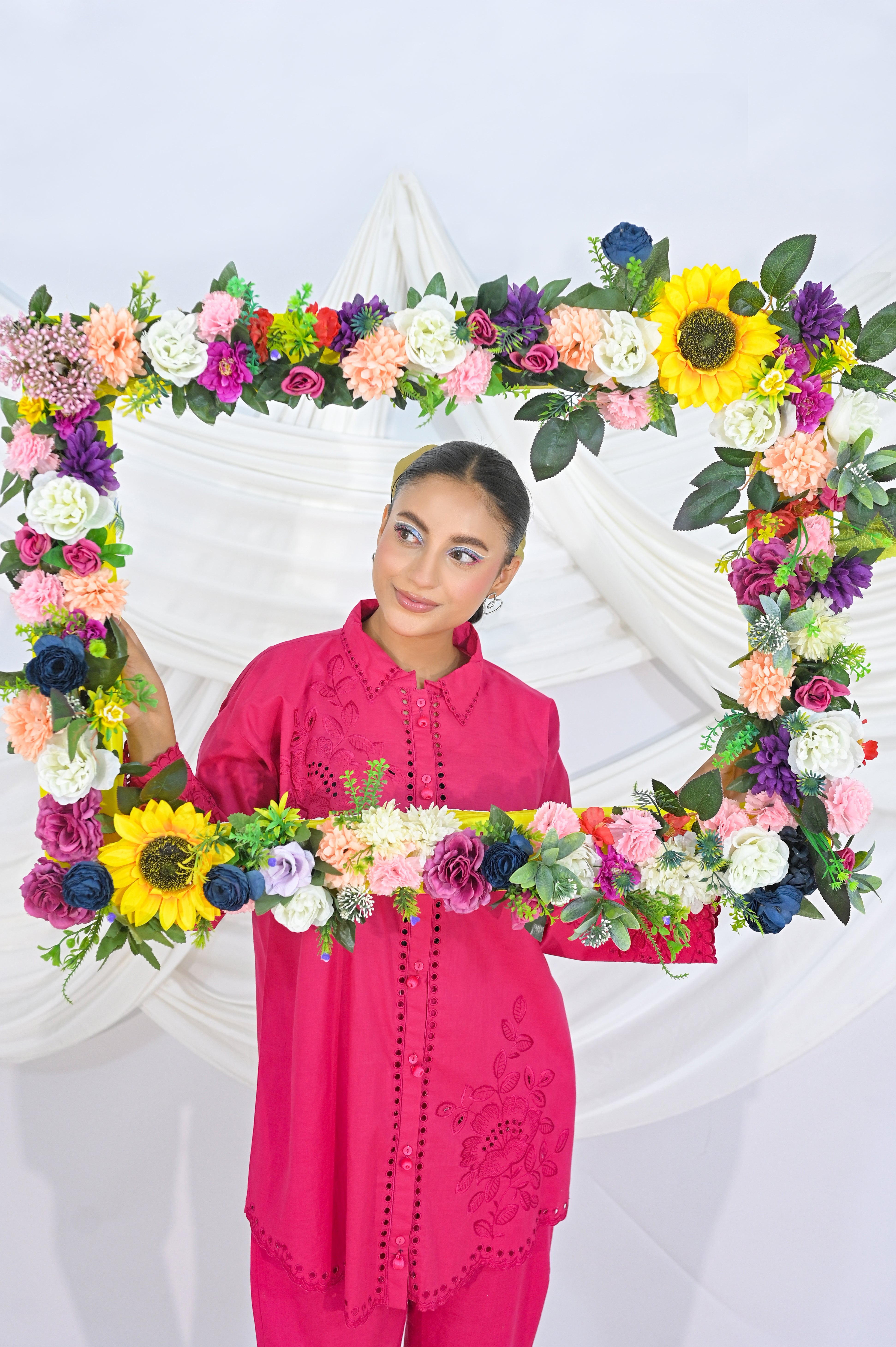 Vibrant hot pink cotton button-down shirt, designed to bring elegance and freshness to everyday dressing, adorned with delicate schiffli embroidery across the front, while its neatly tailored collar is enhanced with matching embroidered details.