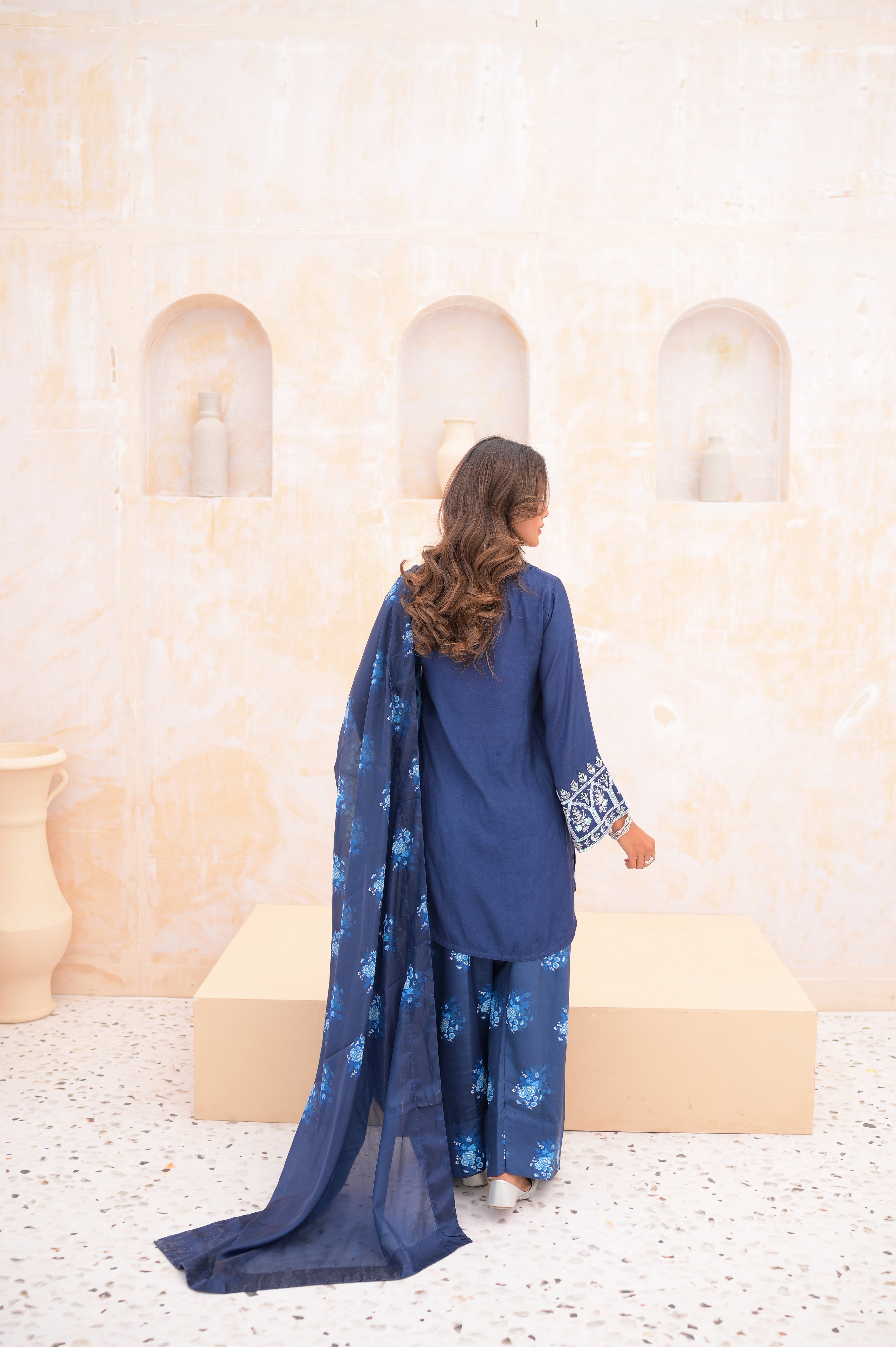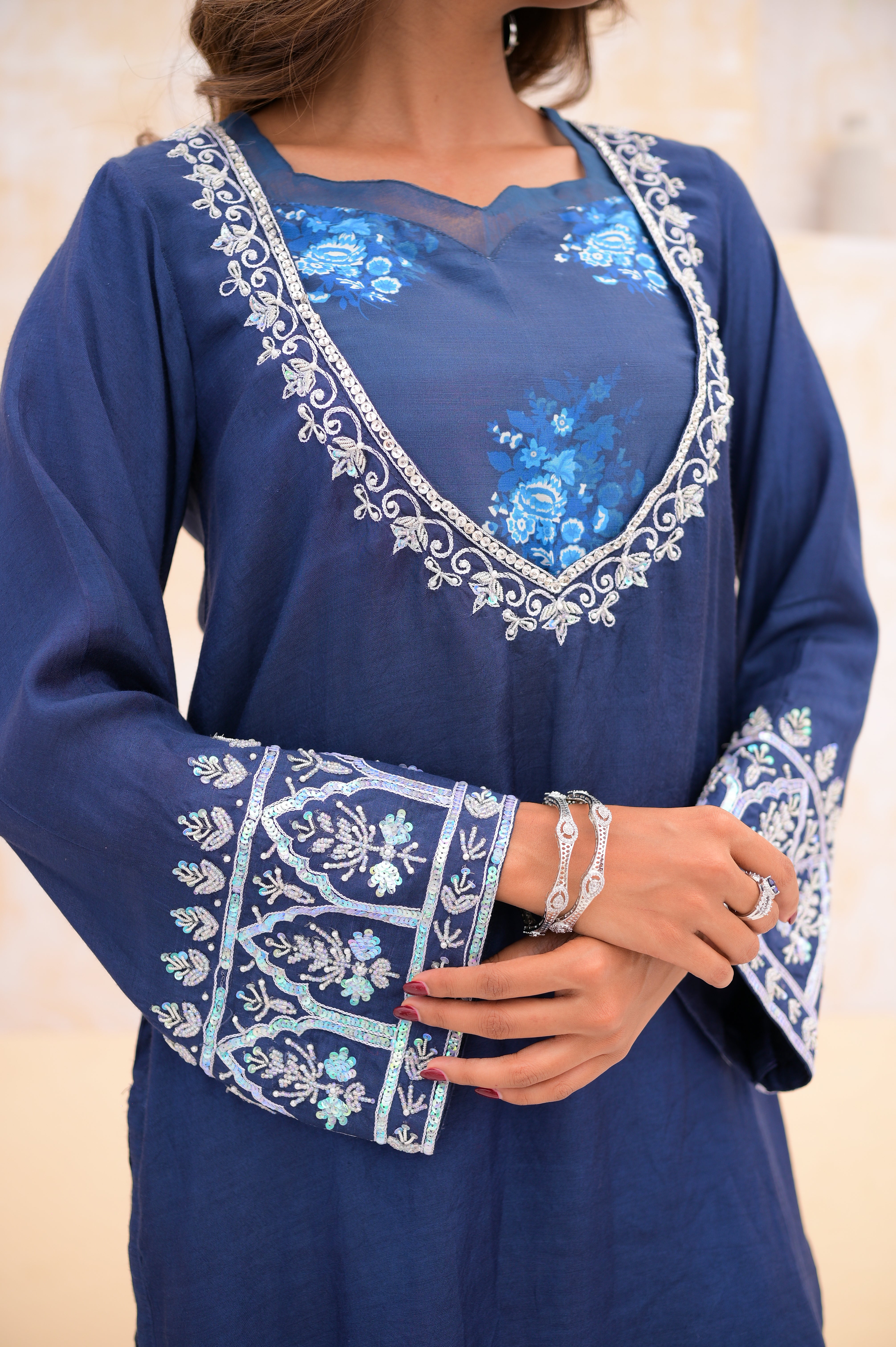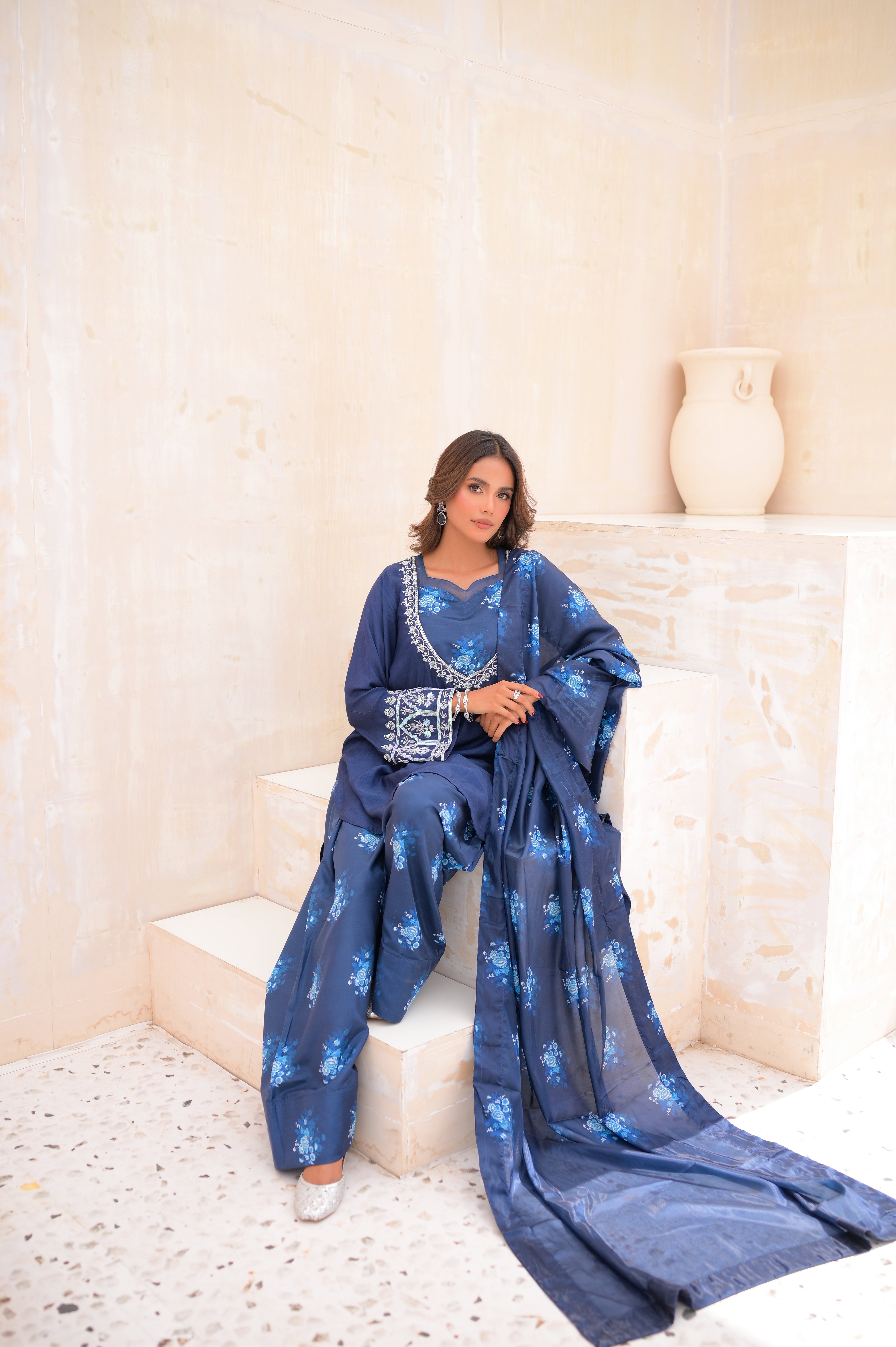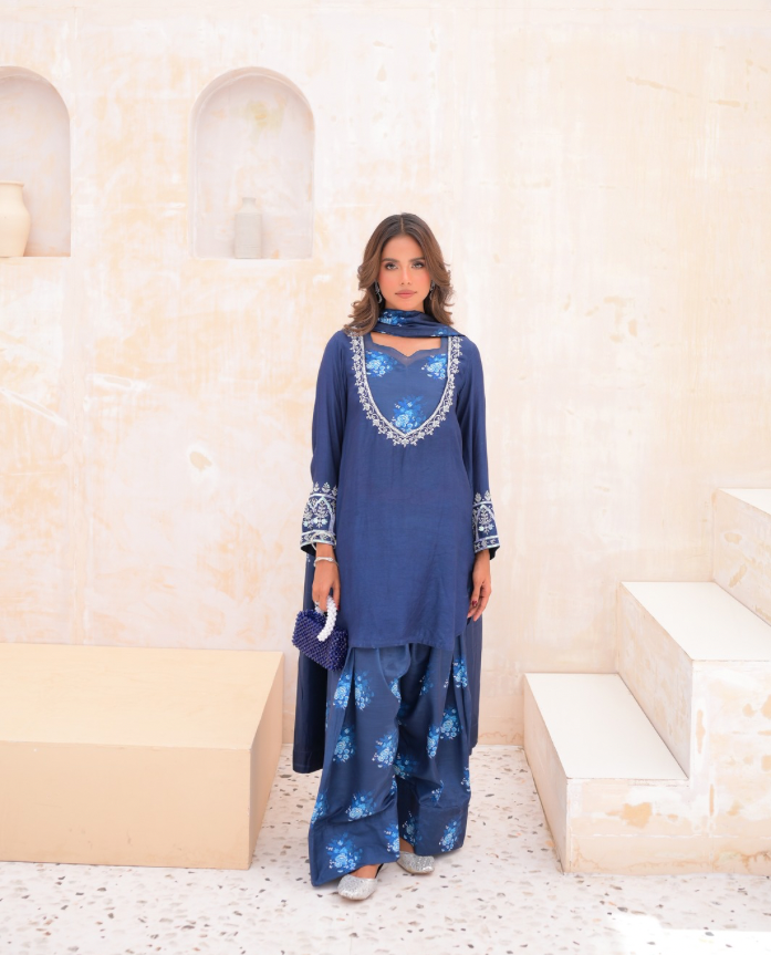 It is a 3 pc farshi shalwar set in cotton silk fabric containing printed floral dupatta and shirt with hand embellishment details on sleeves and neck with slight print.