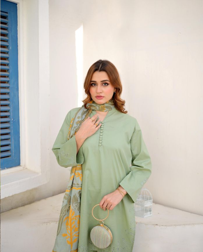 Introducing our 3-piece set with cutwork on it with printed green silk dupatta with it.