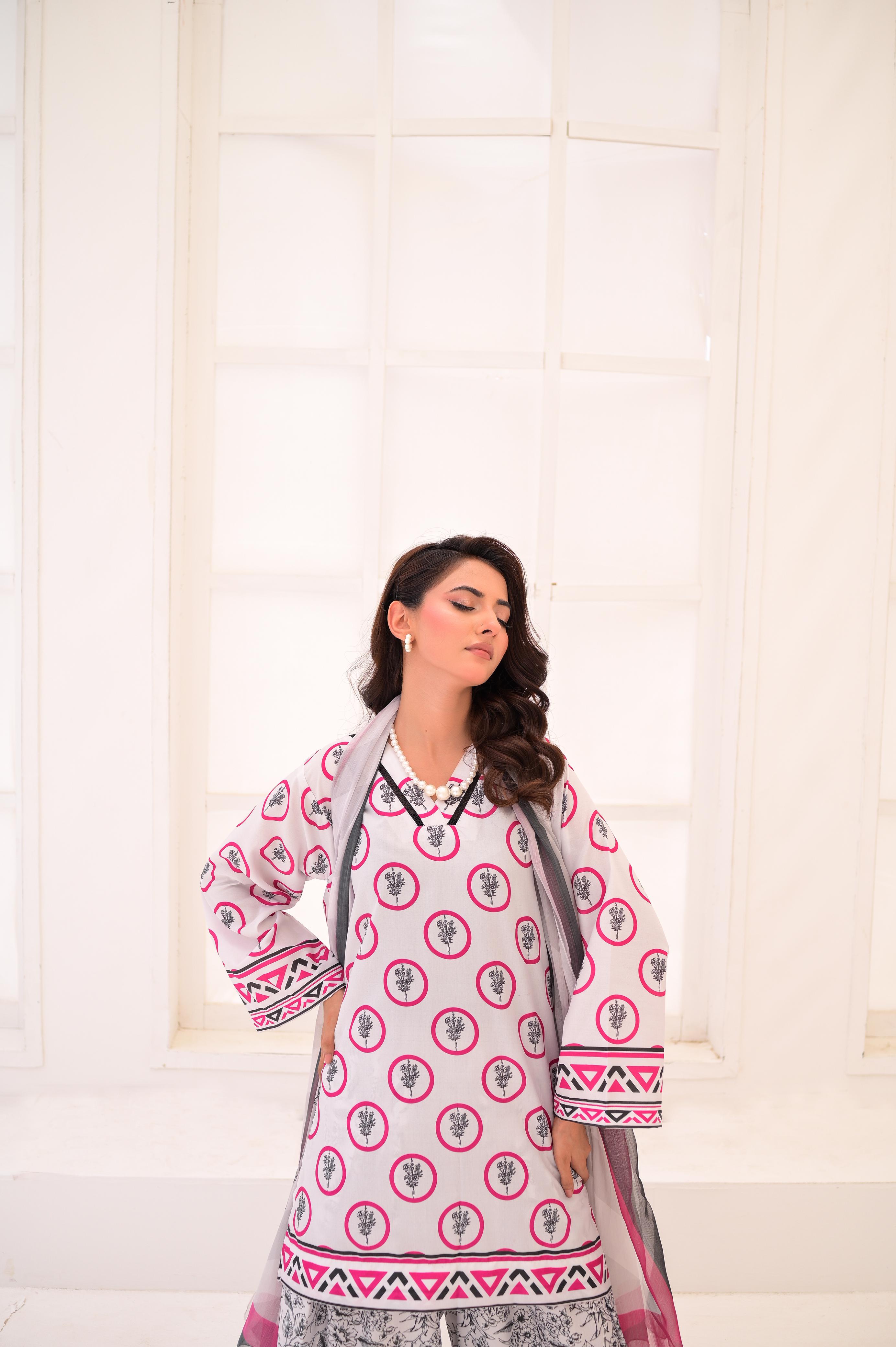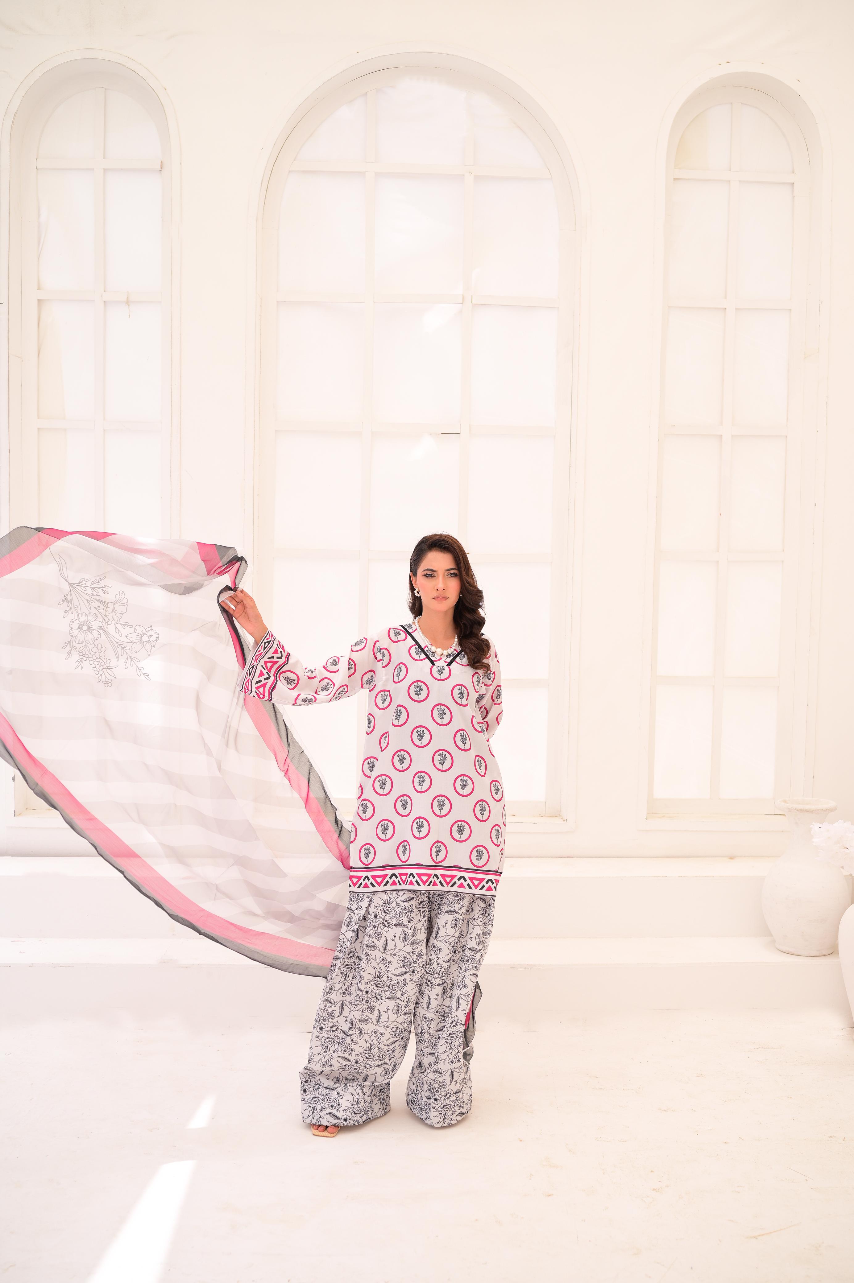 3 Piece stitched article. Fabric swiss lawn. dupatta chiffon.