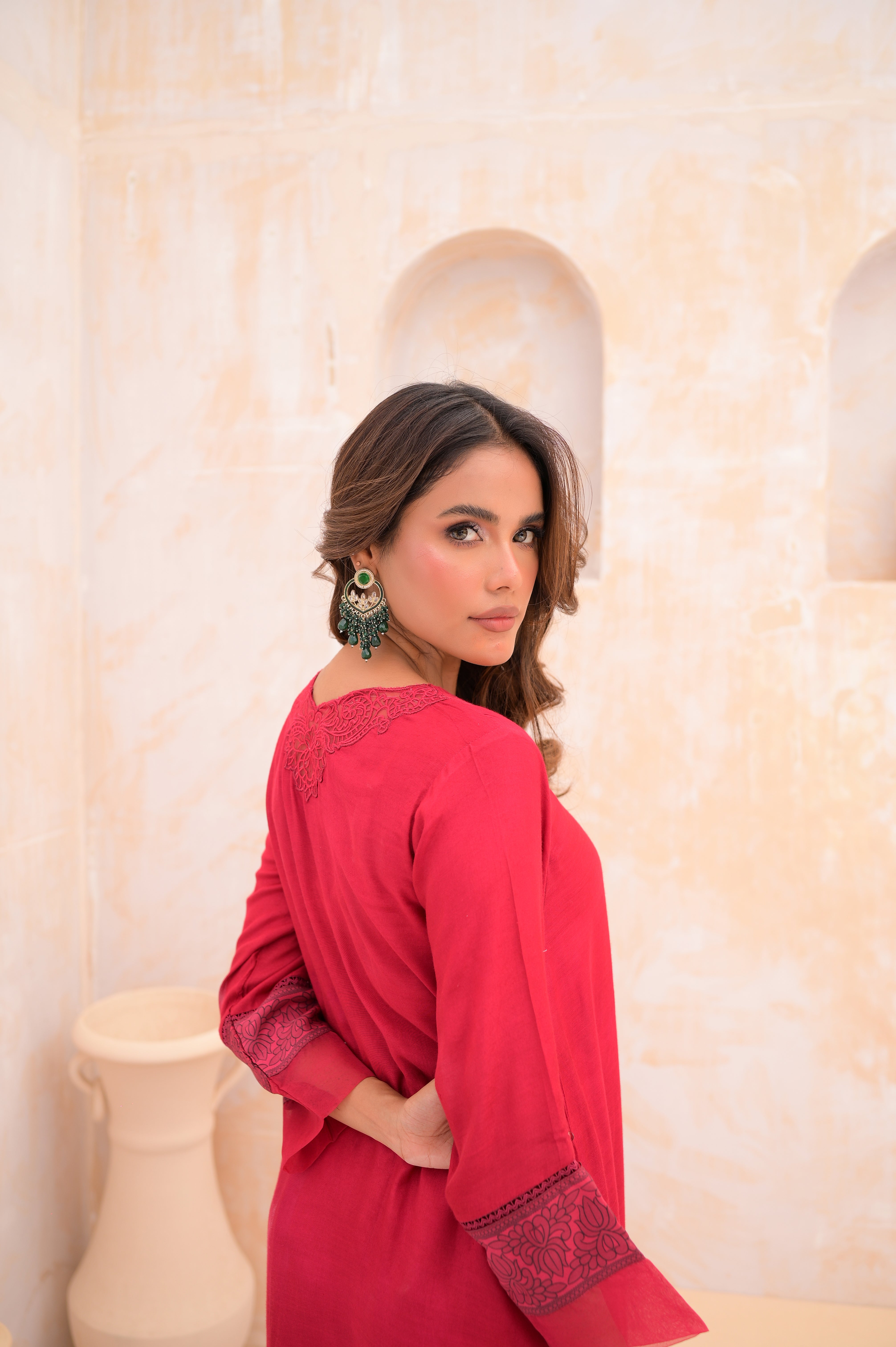 3 Piece stitched formal outfit deep Ruby red cotton silk fabric having embroidered bunch on back neck and embroidered dori detailing on front neck with  embroidery bunches on side slits...
