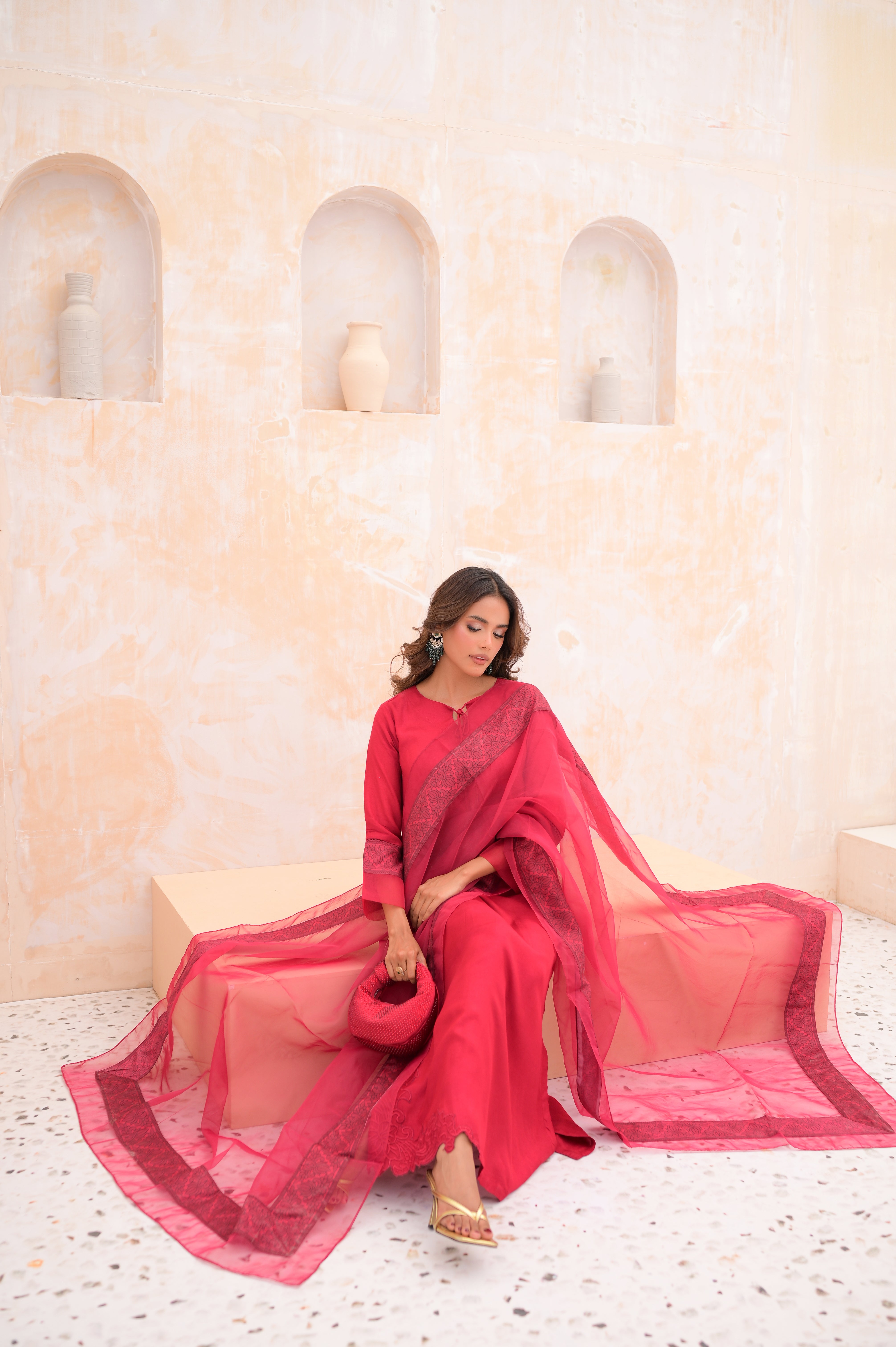 • 3 Piece stitched formal outfit deep Ruby red cotton silk fabric having embroidered bunch on back neck and embroidered dori detailing on front neck with  embroidery bunches on side slits with printed border on organza dupatta and sleeves pairing with cigarette pants.